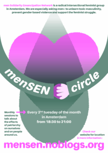 We facilitate monthly talking sessions (menSEN Circle). These meetings are open to anyone who wants to fight the patriarchy but we have a focus on masculinity. We meet 18:30-21:00 every 2nd tuesday at Plantage Doklaan 8, Amsterdam.